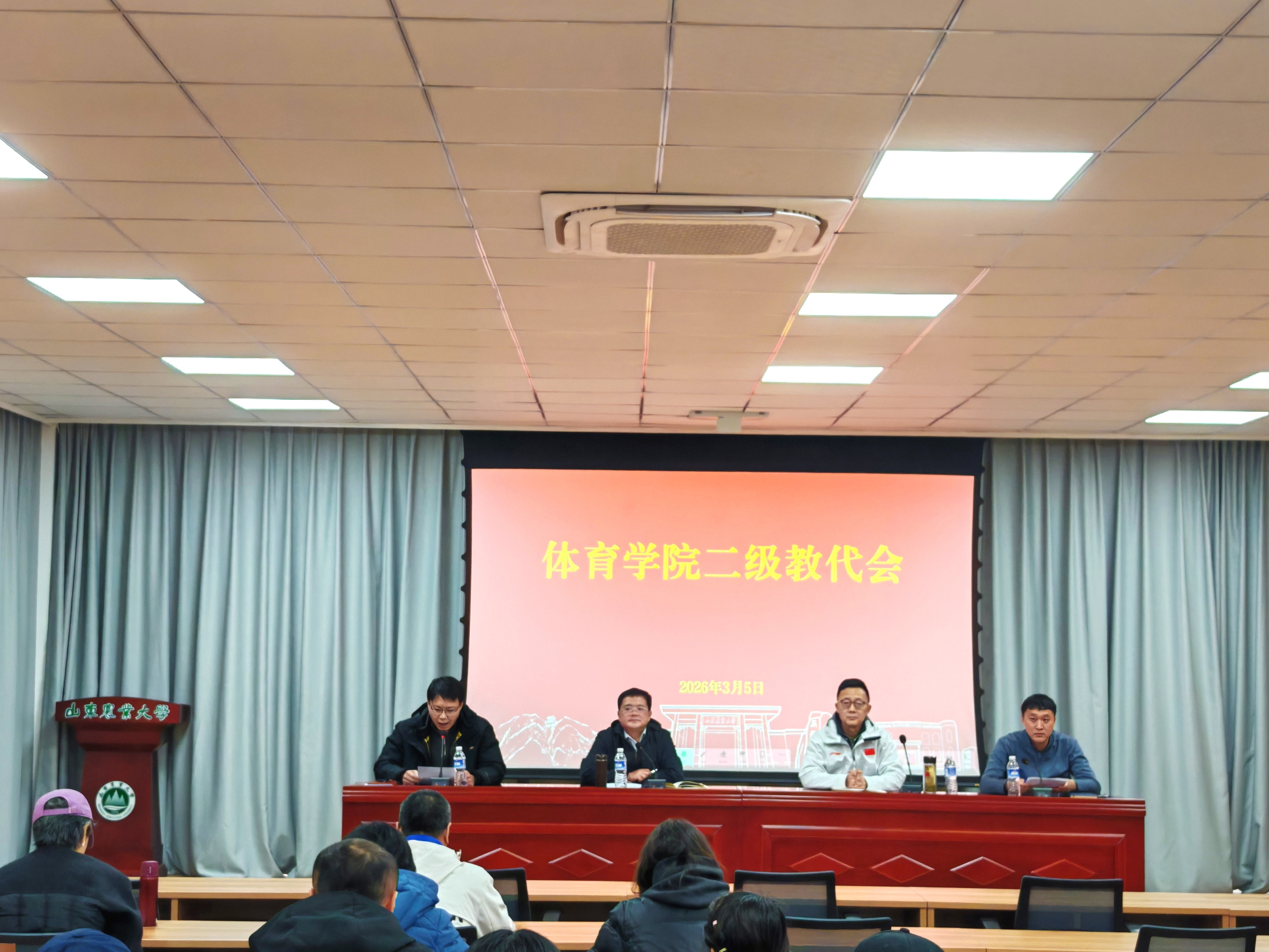 会上,学院党委书记韩同吉首先传达学校党委八届七次会议精神和学校双代会核心要求,带领全院教职工深入学习学校党委书记张然、校长冷畅俭在学校双代会上的讲话。他指出,2026年是学校“双甲子”校庆之年,更是打赢“双一流”突破攻坚战的关键之年,张然书记的讲话回顾了山农百廿办学的深厚积淀,明晰了学校发展的当下形势,擘画了未来发展的奋进蓝图,为学校工作指明了方向、提供了遵循。体育学院作为学校人才培养的重要组成部分,要深刻把握学校“三个一”工作要求,把思想和行动统一到学校党委的决策部署上来,立足体育学科特色和学院办学定位,将传承山农精神融入学院发展全过程。全院教职工要树立“校兴我荣、校衰我耻”的命运共同体意识,以学校“双一流”建设为核心目标,主动把学院工作融入学校发展大局,坚守立德树人根本任务,发挥体育育人独特作用,以更加强烈的责任担当、更加务实的工作作风,凝聚起学院发展的强大合力,为学校打赢“双一流”突破攻坚战、迎接双甲子校庆贡献体育力量。