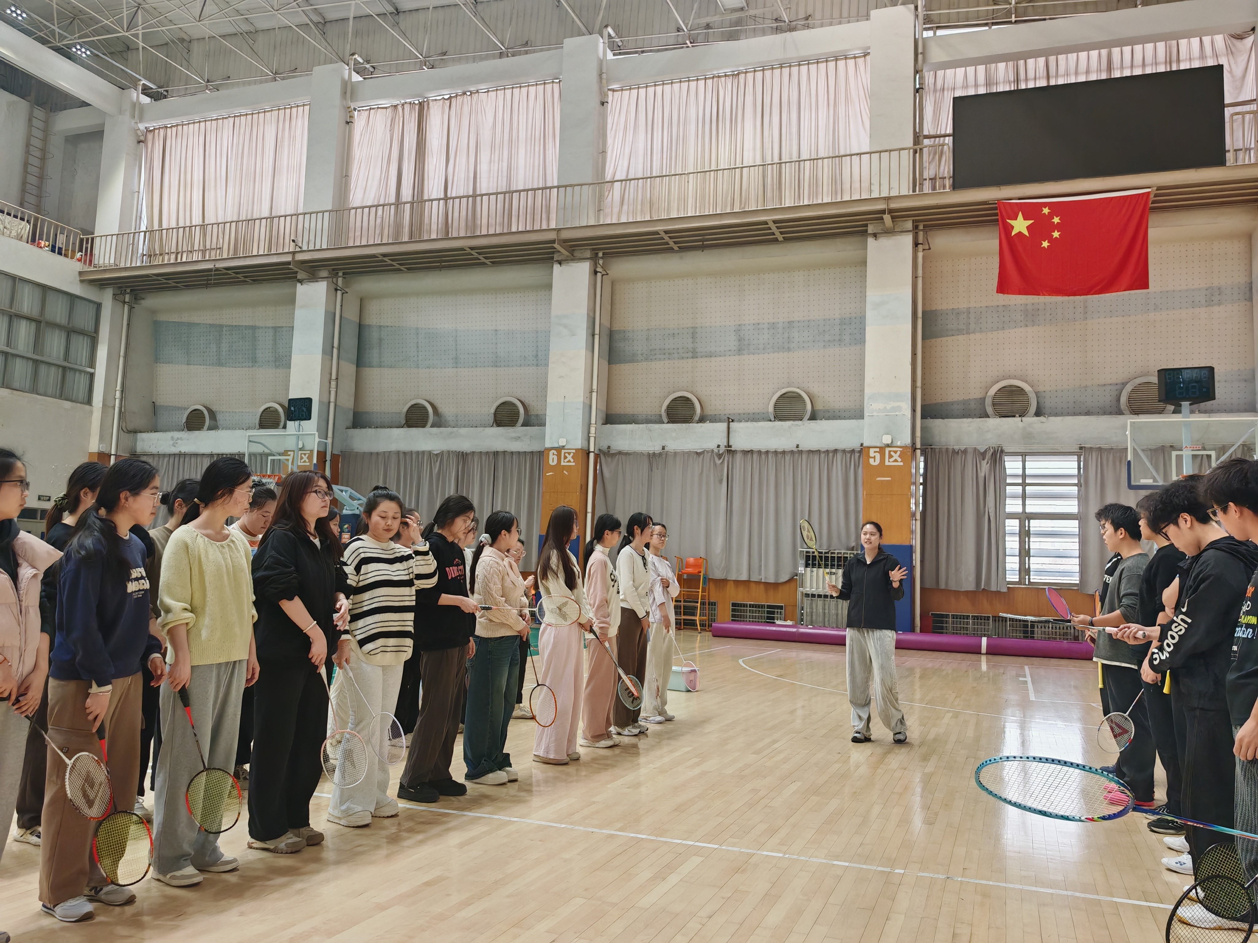 在乒乓球课上,郑亮老师聚焦核心技能入门教学,从直拍与横拍握拍法入手,逐一讲解接发球、近台站位、屈膝含胸的重心控制要领,通过徒手挥拍分解训练、球感适应性练习、正手攻球动作规范等环节,由浅入深引导学生搭建动作框架。在羽毛球课上,郑雨老师围绕正手握拍规范、基础准备姿势、身体重心调整进行细致教学,重点示范正手发高远球分解动作、基础并步与跨步移动技巧,通过动作拆解、分组实操、一对一纠错等方式,帮助学生快速掌握核心要领。