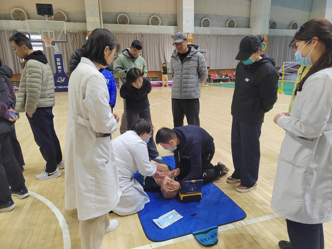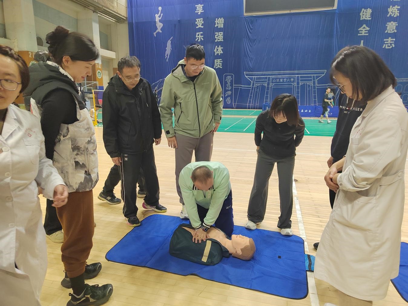 培训中,孙东华院长、冯海然医生结合临床急救经验,围绕心肺复苏、AED使用、海姆立克急救法等急救技能展开系统理论教学,细致讲解操作要点、注意事项及运动场景下的急救处置原则,其他医护人员现场展示急救操作流程。理论讲解结束后,在运动现场设置多个实操演练区,配备模拟人、AED自动体外除颤器等专业教具,孙院长带领急救团队进行分组现场指导,针对教职工实操过程中胸外按压位置偏移、通气不充分等常见问题逐一纠正、手把手教学。参训教职工踊跃参与心肺复苏、AED使用等实操练习,并通过体育赛事群体伤害场景模拟演练,提升应急协同施救能力,在“学练结合”中熟练掌握各项急救技能的操作要领。